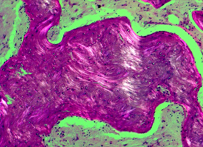 In der Doppelbrechung wird die unregelmässige mosaikartige Struktur der Spongiosabälkchen besonders deutlich.