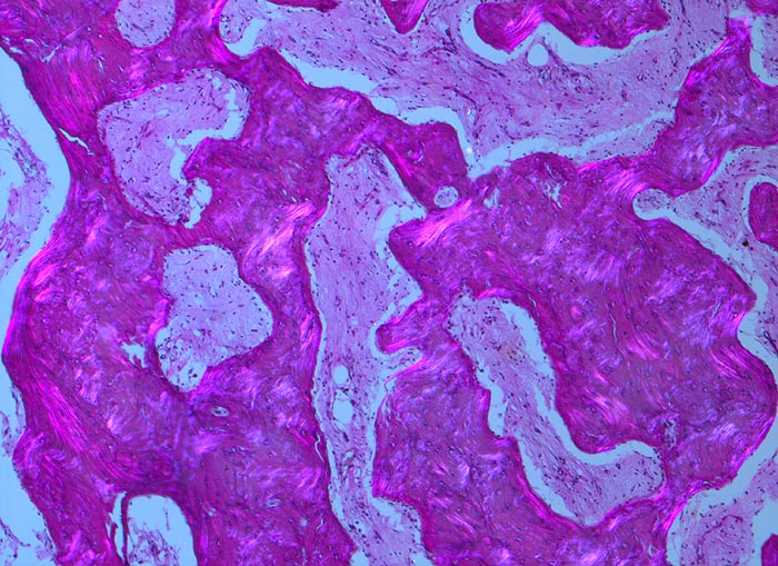 Die Patientin hatte wiederholt über Knieschmerzen geklagt. Autoptisch zeigte das Kniegelenk eine leichte Arthrose. Aus der auffallend verdickten Tibia wurde eine Gewebsprobe zur Untersuchung entnommen.