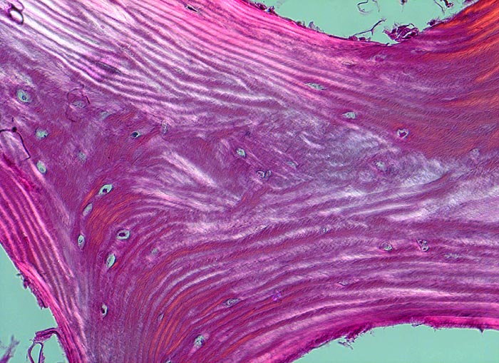 In der Doppelbrechung werden die regelmässig angeordneten Lamellen dieses Spongiosabälkchens besonders gut sichtbar.
