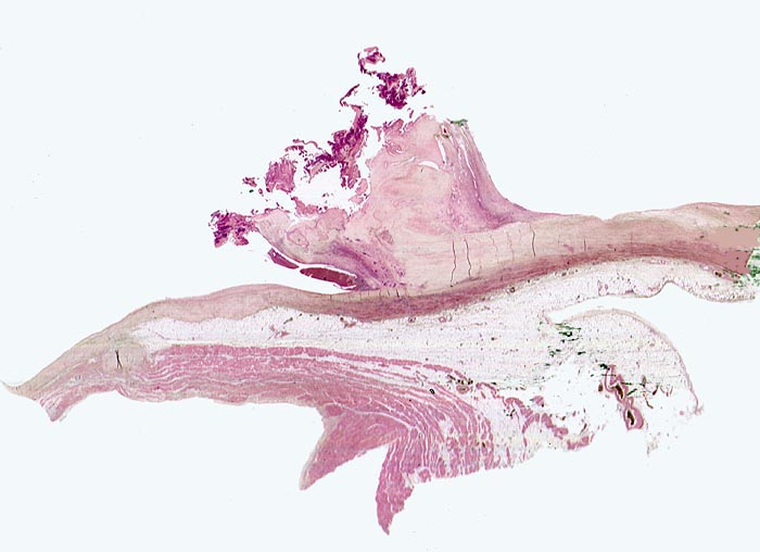 Grobe polypöse Deformation und Destruktion der Aortenklappe. Das destruierte Klappengerüst wird durchsetzt von Bakterienkolonien und ist herdförmig dystroph verkalkt. Kleiner Thrombus am Klappenansatz. Aorta. Myokard.