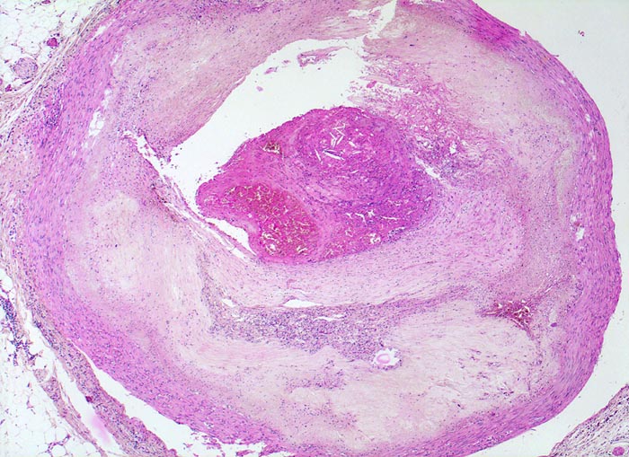 Massive Sklerose und Verbreiterung der Intima. Neovaskularisationen in der Intima. Atrophie der Media. Partiell organisierte Thrombose über einem rupturierten Atheromherd. Der Thrombus enthält Cholesterinkristalle aus dem rupturierten Atherom.