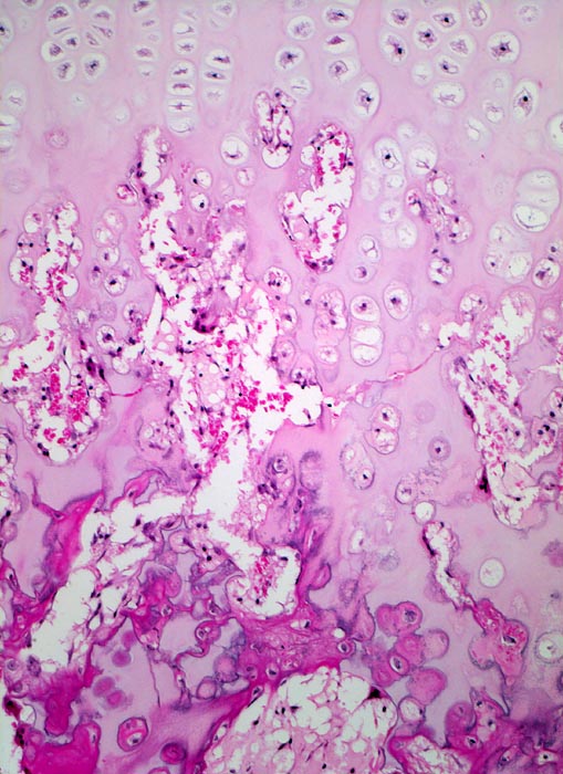Übergang der hyalinen Knorpelkappe in den knöchernen Stiel über eine enchondrale Ossifikationszone ähnlich wie in der Epiphysenfuge: grossblasiger Säulenknorpel wird gefolgt von der Verkalkungszone mit verkalkter Knorpelmatrix. In der Eröffnungszone resorbieren mehrkernige Chondroklasten einen Teil der verkalkten knorpligen Grundsubstanz. In der Ossifikationszone scheiden Osteoblasten auf den stehengebliebenen verkalkten Knorpelbälkchen Osteoid ab, welches schliesslich verkalkt.