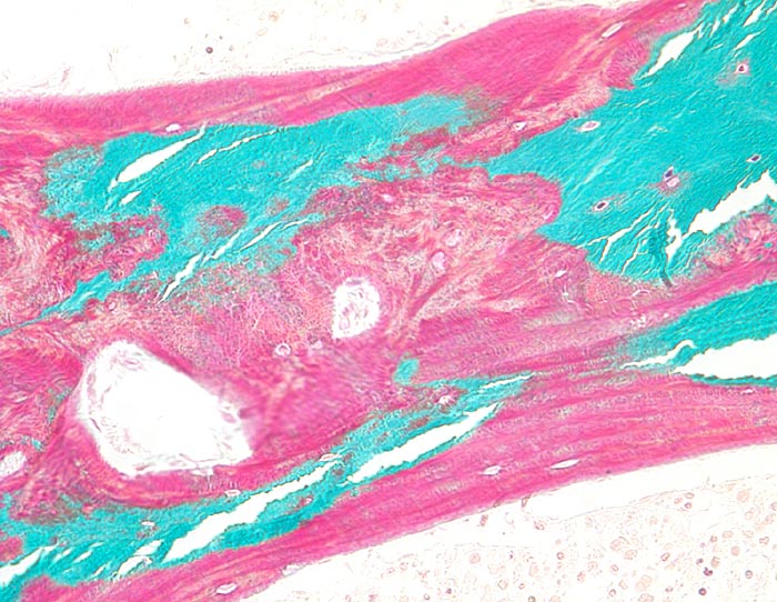Der lamelläre Aufbau des roten, nicht mineralisierten Osteoids spricht für weitgehend normal erfolgenden Anbau der Knochenmatrix. Nur der Mineraleinbau ist mangels Angebot nicht möglich, die Osteoblastenfunktion ist nicht gestört. Im Zentrum "begrabenes" Osteoid.