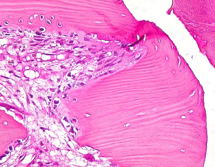 Frakturspalt mit Fibrin. Devitalisierter ortsständiger Knochen mit leeren Osteozytenhöhlen begrenzt den Frakturspalt. Osteoklasten bauen das devitalisierte Gewebe ab. Granulationsgewebe im Markraum.