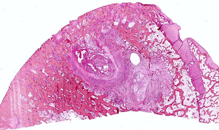 Die Knorpelbedeckung der Gelenkfläche fehlt grösstenteils, die Oberfläche selbst ist deutlich abgeflacht und zeigt eine starke sekundäre Sklerose der freiliegenden Spongiosa mit Anbau von breiten Faser- und Lamellenknochensäumen an die alten Bälkchen. In der Gelenkfläche mehrere kleine Bezirke mit Faserknorpel, der metaplastisch entstanden ist. Die Spongiosa in der Tiefe zeigt im Bereich der Belastungszone eine fortschreitende Sklerose, während die Entlastungszonen craniolateral eine leichte Osteoporose aufweist. Am craniolateralen Rand Entwicklung eines Randosteophyten, welcher über den Resten des dort noch vorhandenen Gelenkknorpels entstanden ist (Verdoppelung des Knorpels). Grössere sogenannte Geröll- oder Ueberlastungs-Zyste, welche einem Nekrosebezirk mit Abbau des toten Gewebes und Ersatz durch neu entstandenes Bindegewebe entspricht. Dieses Bindegewebe wird sekundär dann wieder verknöchert.