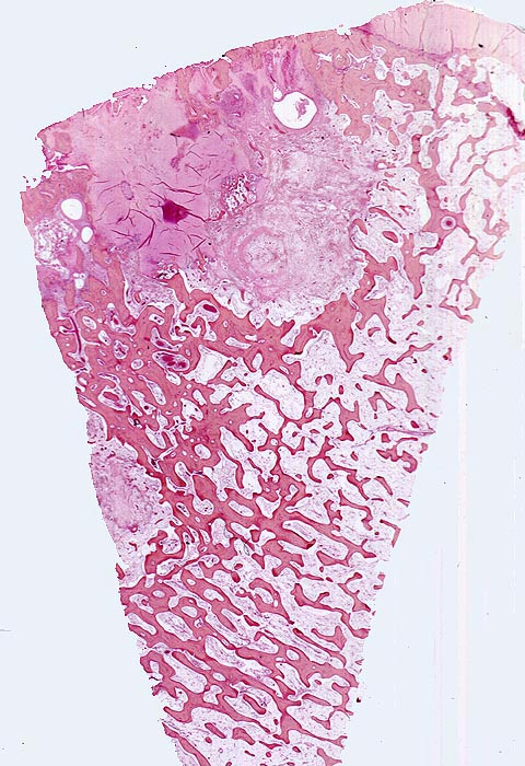 Die Knorpelbedeckung der Gelenkfläche fehlt grösstenteils, die Oberfläche des Femurkopfes ist deutlich abgeflacht. Randlicher Rest des Gelenkknorpels. Grössere sogenannte Geröll- oder Überlastungs-Zysten, welche einem Nekrosebezirk entsprechen.