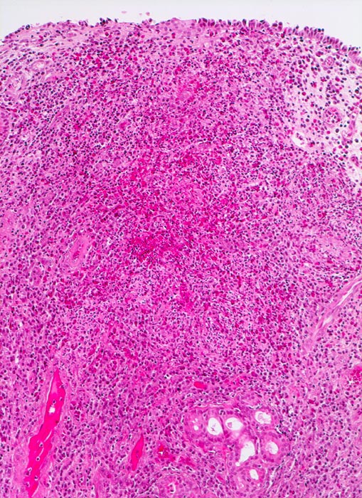 Einzelne seromuköse Schleimdrüsen und sehr dichtes gemischtes Entzündungsinfiltrat im vermehrten Stroma.