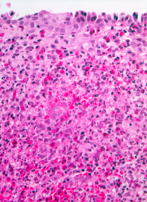 Das Zellen des respiratorischen Epithels weisen aufgrund der schweren Entzündung reaktiv vergrösserte Kerne mit Nukleolen auf. Das Stroma ist massiv entzündlich infiltriert. Es überwiegen eosinophile Granulozyten mit rotem granulärem Zytoplasma. Daneben finden sich Plasmazellen, neutrophile Granulozyten und (myo)fibroblastäre Zellen.