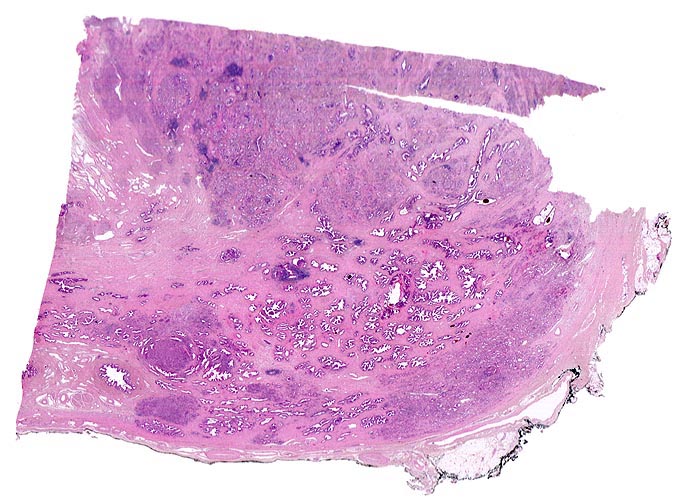 Multiple Karzinomherde infiltrieren das Prostatagewebe. Die normalen Drüsen sind deutlich grösser als die Karzinomdrüsen und enthalten in der Übersichtsvergrösserung erkennbare Lumina. Da die Karzinomdrüsen deutlich kleiner sind, erscheinen die Karzinomherde in der schwachen Vergrösserung als dunkle, unscharf begrenzte Flecken ohne erkennbare drüsige Strukturen. Der Resektionsrand ist mit schwarzer Tusche markiert (schwarzer Streifen am Rand des Präparates).