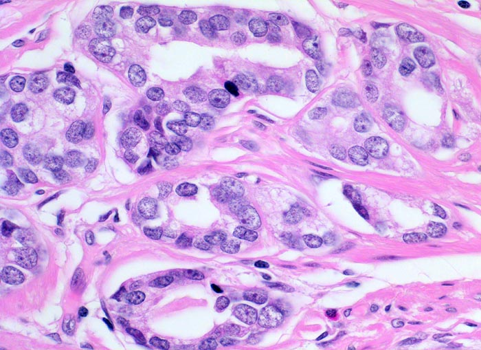 Mittelgrosse, gut geformte Karzinomdrüsen ausgekleidet durch ein einreihiges kubisches Epithel ohne Basalzellschicht. Die einzelnen Drüsen sind voneinander durch wenig Stroma getrennt. Die Karzinomzellen haben deutlich vergrösserte hyperchromatische Kerne mit deutlich erkennbaren, aber nicht sehr grossen Nukleolen.