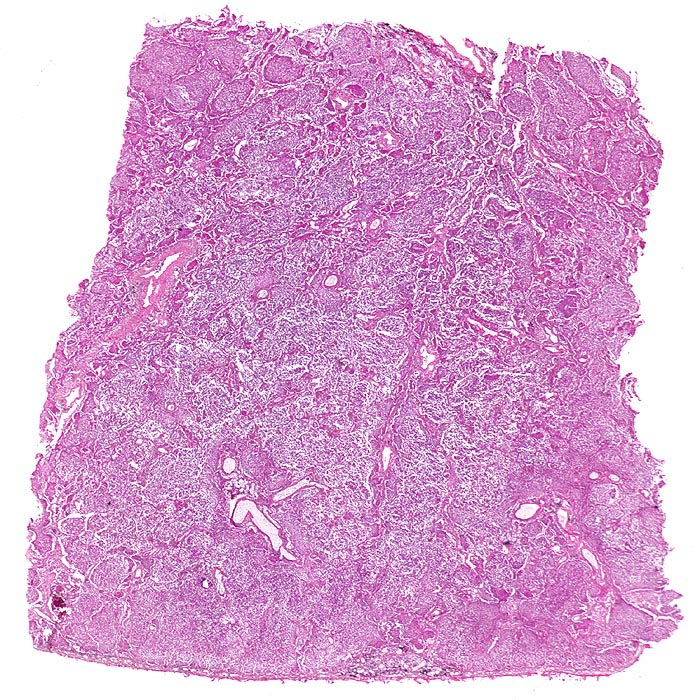 Alle Alveolen sind gleichmässig und diffus befallen und im selben Stadium der Entzündung. Sie sind angefüllt mit fädigem Fibrin und neutrophilen Granulozyten.