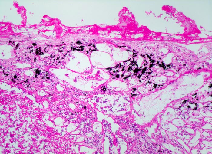 Die Pleura visceralis ist mit Fibrin belegt. Die angrenzenden Alveolen sind angefüllt mit fädigem Fibrin und neutrophilen Granulozyten. Interstitielles Bindegewebe mit schwarzem Anthrakosepigment.