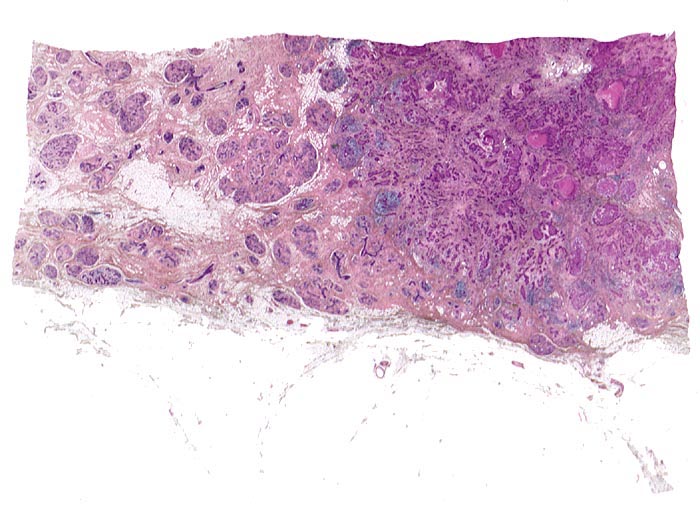 Links im Bild normale Drüsenläppchen. Rechts das Karzinom ohne erkennbare Läppchenstruktur mit Entzündungsinfiltraten im Bereich der Invasionsfront und herdförmigen Tumornekrosen.