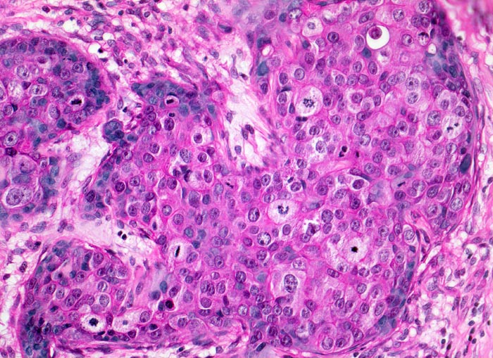 Solide Tumorzellplatten mit zahlreichen Mitosen.