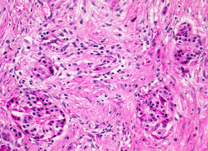Während die Azini das exokrine Pankreasparenchym zunehmend fibrosieren und schliesslich ganz verschwinden, bleibt das endokrine Pankreas relativ gut erhalten. Nach Verschwinden der Azini sind im fibrosierten Gewebe Pankreasinseln zurückgeblieben. Geringgradiges lymphoplasmazelluläres Entzündungsinfiltrat.