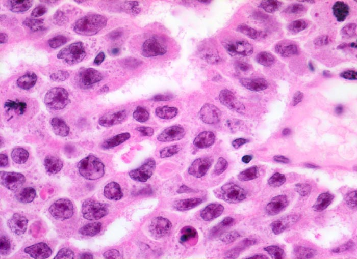 Trabekuläres Tumorwachstum unterbrochen von dünnwandigen Blutgefässen. Die Tumorzellkerne sind gross, ausgesprochen polymorph, entrundet und hyperchromatisch. Mitosen und eine Apoptose zeugen von einem stark erhöhten Zellumsatz.
