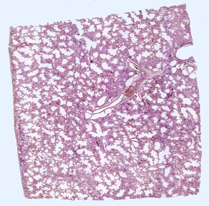 In der Übersicht ist eine diffuse Verbreiterung der Alveolarsepten erkennbar.