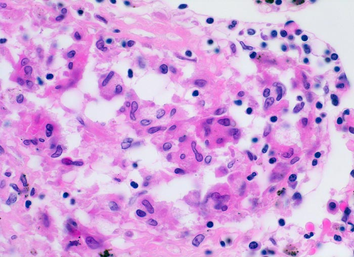 Produktives, nicht nekrotisierendes Granulom mit zahlreichen Epitheloidzellen, Riesenzellen vom Fremdkörpertyp und einem peripheren Saum von Lymphozyten und einzelnen Plasmazellen.