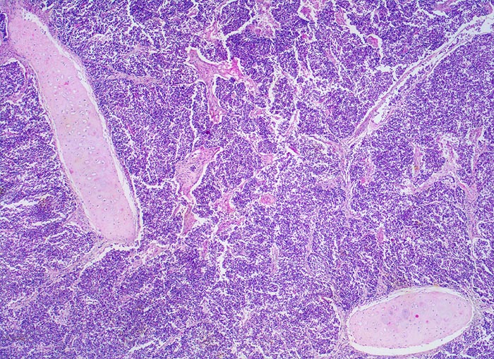 Das Karzinom bildet Stränge, die von schmalen Bindegewebssepten durchzogen werden. Das Tumorgewebe hat einen Segmentbronchus infiltriert und zerstört. Inseln von stehengebliebenem Bronchialknorpel werden vom Tumor umflossen. Aufgrund des hohen Kernanteils ist der Tumor blau gefärbt.