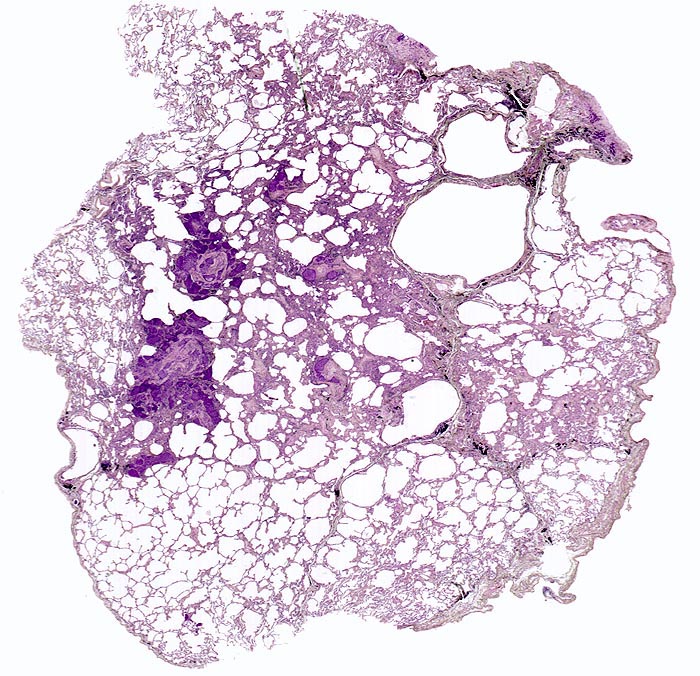 In der Übersicht sind mehrere Tumorherde erkennbar sowie eine Destruktion des Lungenparenchyms im Bereich der mit Anthrakosepigment schwarz angefärbten Azinuszentren (zentroazinäres Emphysem).