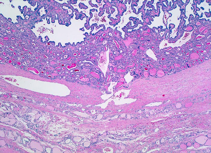 Nur etwa 10% der papillären Karzinome sind vollständig bekapselt. Die bekapselten Tumoren haben eine bessere Prognose.