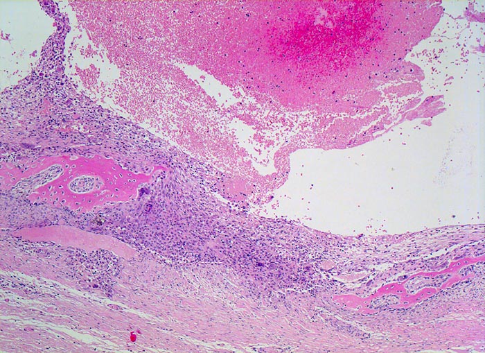 In der Übersicht erkennt man einen pseudozystischen Hohlraum ohne Epithelauskleidung, welcher Erythrozyten enthält. Pseuozystenwand und $o{as16961Setpum} Septum enthalten Riesenzellen und mononukleäre Zellen. Daneben sieht man parallel zur Pseudozystenwand gelegen neugebildeten Faserknochen, welcher die Wand gleichsam "abstützt".