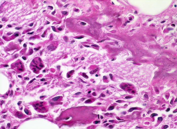Atypische spindelige Tumorzellen mit hyperchromatischen Kernen bilden fein verzweigtes schmales verkalktes Osteoid. Tumorzellen liegen teils mitten im Osteoid gefangen. Neben den Tumorzellen mehrkernige reaktive osteoklastäre Riesenzellen.