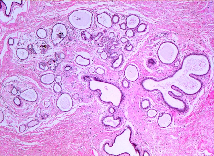 Stroma der Drüsenläppchen ebenfalls fibrosiert (verdichtetes Kollagen). Die Ausführgänge sind teilweise erweitert und enthalten teilweise Mikrokalk.
