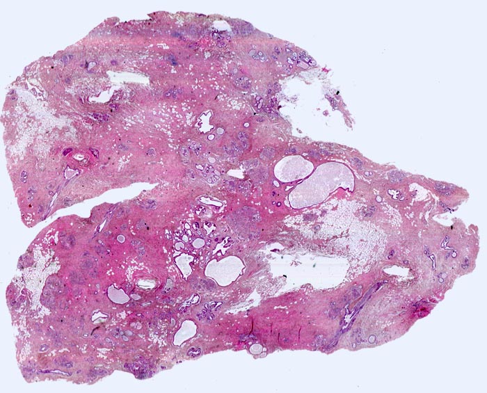Ausgedehnte Fibroseareale schliessen kleine Inseln von Fettgewebe ein. Zahlreiche Gänge sind unterschiedlich stark dilatiert. Zusammen ergibt sich die Diagnose einer fibrös zystischen Mastopathie.