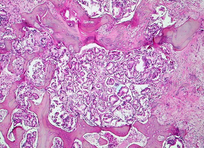 Im Zentrum die kleinen dicht liegenden Karzinomdrüsen. Der Knochen wird stellenweise abgebaut. Fokal ist eine Faserknochenneubildung erkennbar.