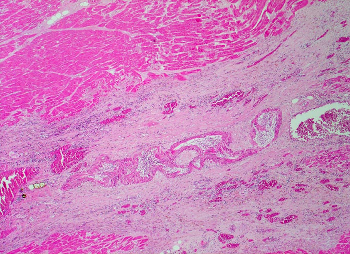 Ausgedehnter subakuter Myokardinfarkt von Hinterwand und Septum. Im Infarktrandbereich perakute Myokardnekrosen.