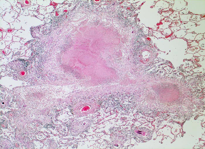 Exsudative Granulome in unmittelbarer Umgebung von Gefässen. Der zugehörige Bronchiolus ist vollständig entzündlich zerstört. Die Granulome bestehen aus einer zentralen käsigen Nekrose umgeben von einem helleren Epitheloidzellwall und ganz aussen einem blauen Saum von Lymphozyten. Daneben einzelne kleinere rein produktive nicht verkäsende Granulome.