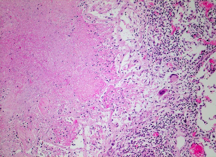 Granulom mit zentraler verkäsender Nekrose gefolgt von einem Epitheloidzellwall mit Riesenzellen vom Langhanstyp und einem äusseren Saum von Lymphozyten.