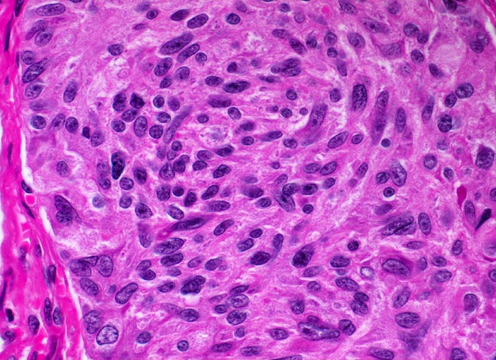 Solider Tumor mit teils spindeligen, teils polygonalen Zellen. Zytoplasma ist reichlich vorhanden. Die Zellgrenzen sind unscharf. Die Zellkerne sind polymorph und zeigen das typische feinkörnige Chromatin endokriner Zellen.