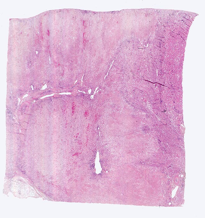 Ausgedehnte anämische Nekrose mit aufgehellter verwaschener Struktur. Stellenweise ist ein hämorrhagischer Randsaum erkennbar. Ein sehr schmaler Saum von vitalem Parenchym ist an der Rindenoberfläche dank Kollateralen aus der Nierenkapsel erhalten. Anschnitt einer Arteria arcuata mit rekanalisiertem Verschluss.