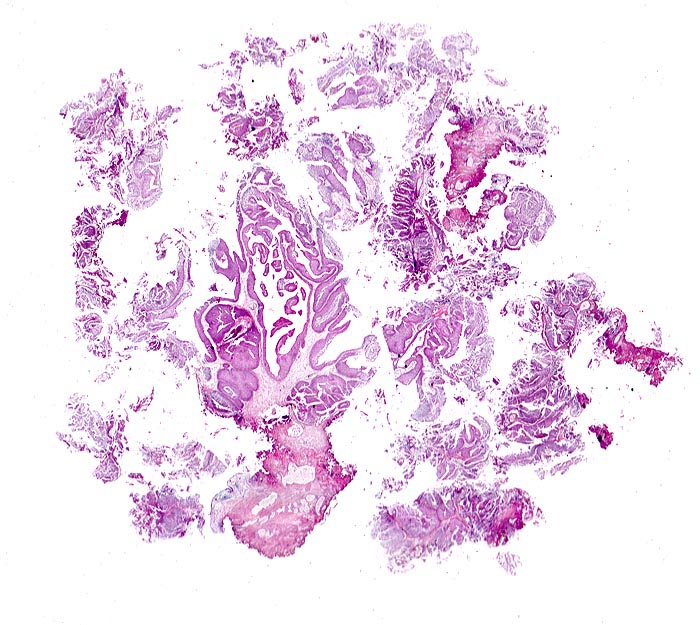 Material einer transurethralen Resektion (TUR-B): multiple Fragmente eines papillären Tumors. Die fibrovaskulären Stromastiele werden von einem verbreiterten Urothel bedeckt. Die Grenzen zwischen Urothel und Stroma sind scharf und sprechen gegen ein invasives Tumorwachstum. Die Beurteilung einer möglichen Stromainvasion muss jedoch in einer stärkeren Vergrösserung erfolgen.