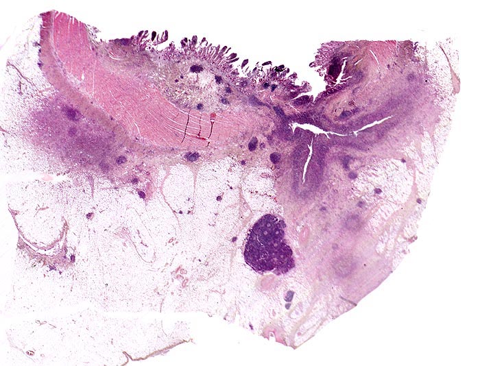Transmurale Entzündung mit Lymphfollikelbildung. Mesenterialer Lymphknoten mit Sekundärfollikeln. Tiefes, bis in das mesenteriale Fettgewebe reichendes schlitzförmiges fissurales Ulkus. Daneben intakte Mukosa.