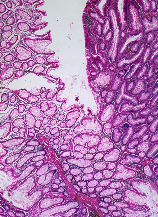 Links im Bild die normale Kolonschleimhaut. Rechts das Adenom, welches in diesem Anschnitt aus tubulären Drüsen besteht. Das Adenom ist aufgrund der grösseren atypischen Kerne und der verminderten Schleimproduktion deutlich dunkler gefärbt als die normale Kolonschleimhaut.