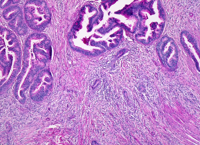 Karzinomdrüsen mit komplexer Architektur in der Submukosa. Dichtes desmoplastisches Stroma und Entzündungszellen umgeben die Tumordrüsen.