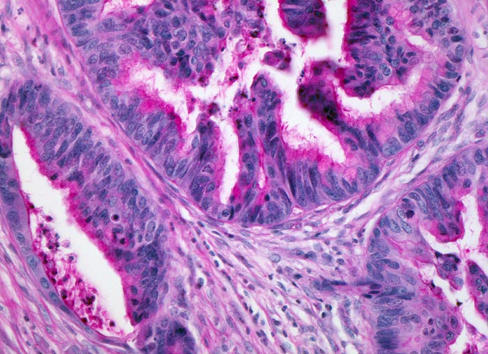 Der Patient wird wegen neu aufgetretener Obstipation abgeklärt. Koloskopisch kommt im Kolon sigmoideum ein polypoider, das Lumen stenosierender stark karzinomverdächtiger Herd zur Darstellung. Die Biopsie zeigt atypische Drüsen mit desmoplastischer Stromareaktion stark verdächtig auf ein invasives Karzinom. Da an der oberflächlichen Biopsie ein invasives Wachstum nicht nachgewiesen werden kann, lässt sich das Karzinom jedoch nicht beweisen. Es wird eine Sigmaresektion durchgeführt.
