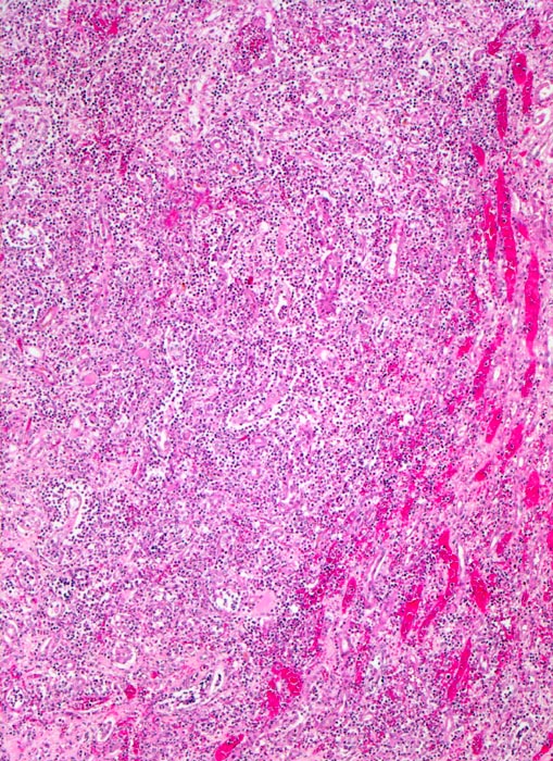 Destruktives streifenförmiges granulozytäres Infiltrat. Die Tubuli sind nicht mehr erkennbar. Am Rand des Infiltrates hyperämische Gefässe (makroskopisch gelber Herd mit rotem Randsaum).