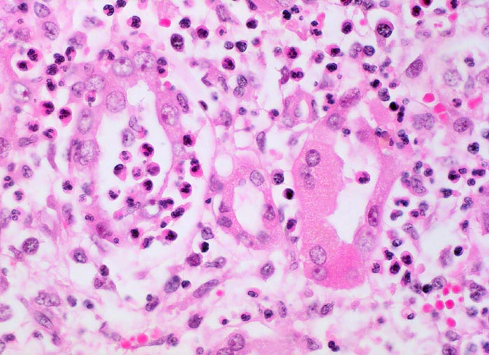 Neutrophile Granulozyten zerstören die Tubulusepithelien. Die Epithelzellen haben vergrösserte bläschenförmige Kerne mit prominenten Nukleolen ( reaktive Atypien). Das Interstitium wird infiltriert von neutrophilen Granulozyten, wenigen Histiozyten und vereinzelten Plasmazellen.