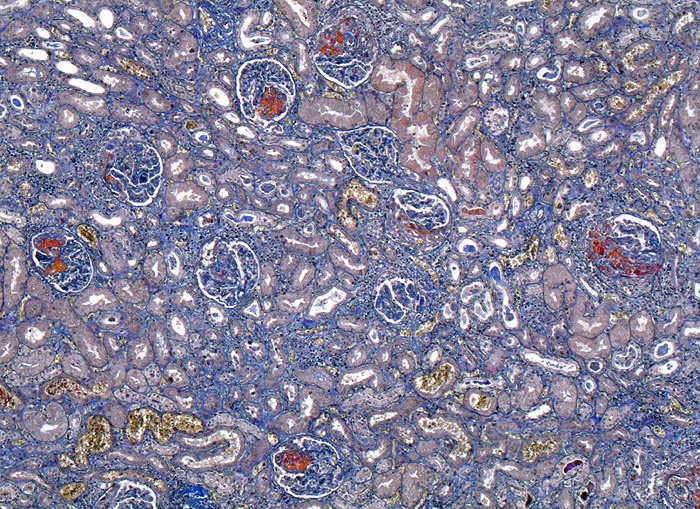 Mehrere Glomerula zeigen frische Schlingennekrosen mit orangen Fibrinexsudaten, teils begleitet von Halbmondbildung. Daneben finden sich auch weitgehend unauffällige Glomerula.