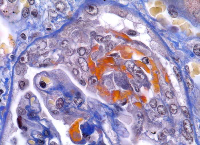 Ausschnitt aus einem frischen segmentalen Halbmond (keine Matrixbildung). Zwischen den proliferierten Zellen des Halbmondes sind orangefarbene Fibrinexsudate erkennbar, die aus rupturierten Schlingen stammen.
