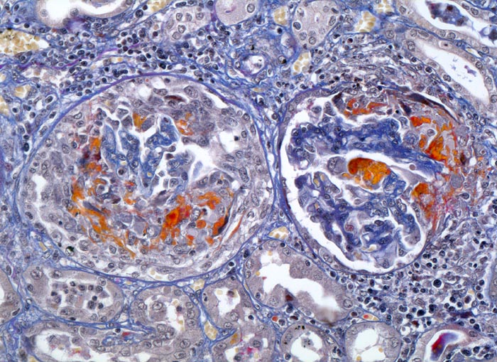 Das Glomerulum links im Bild zeigt ausgedehnte Schlingennekrosen mit Exsudation von Fibrin und Ausbildung eines frischen rein proliferativen globalen Halbmondes. Das Glomerulum rechts im Bild zeigt frische Schlingennekrosen mit exsudiertem Fibrin. Kapselzellproliferate sind noch nicht vorhanden. Über der Schlingenruptur ist auch die Bowman'sche Kapsel rupturiert. An dieser Stelle findet sich eine periglomeruläre teils epitheloidzellige Entzündung.
