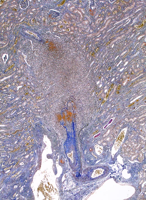 Interlobäre Arterie mit sektorförmiger Nekrose begleitet von einem dichten Entzündungsinfiltrat.