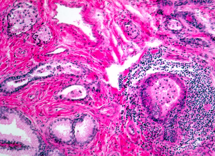 30-40% des histologisch untersuchten hyperplastischen Prostatagewebes zeigt eine mittelgradige bis schwere Begleitprostatitis mit Drüsendestruktion. Diese entzündlichen Infiltrate sind als entzündliche Begleitreaktion aufzufassen und reichen nicht für die Diagnose einer klassischen Prostatitis aus.