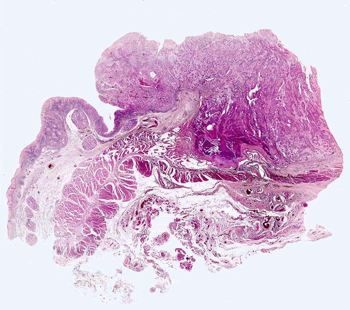 Links im Bild intakte Ösophagusschleimhaut und submuköse ösophageale Drüsen. Rechts im Bild das polypoide exophytische Karzinom. Tumorinfiltration der inneren Hälfte der Muscularis Propria.