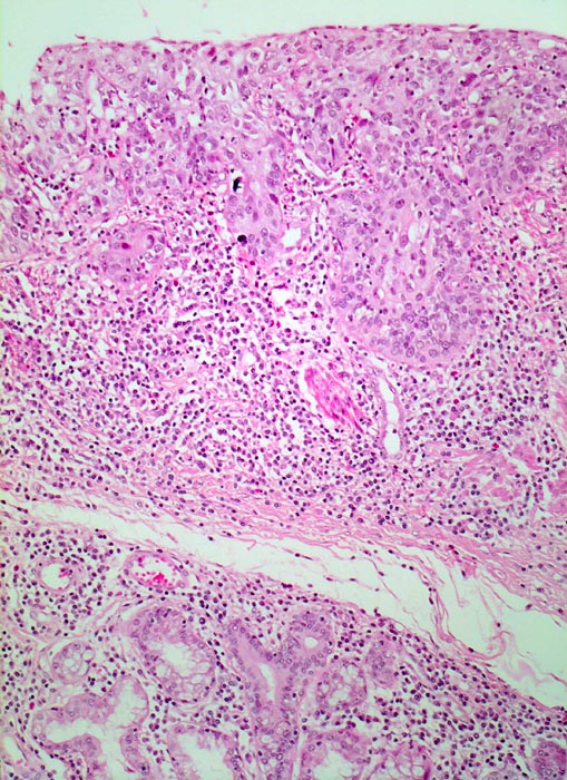 Mukosa aus dem Randbereich des Karzinoms mit schwerer Dysplasie des Plattenepithels (Carcinoma in situ). Die Zellen sind unregelmässig angeordnet und zeigen anstelle der normalen Ausreifung auf der ganzen Epithelbreite deutlich vergrösserte hyperchromatische Kerne. Das Epithel bildet unregelmässige Zapfen, die in das Stroma vordringen. Die Basalmembran scheint in diesem Bildausschnitt jedoch erhalten. Die Submukosa enthält ein dichtes gemischtes Entzündungsinfiltrat. Am unteren Bildrand sind submuköse Schleimdrüsen erkennbar.