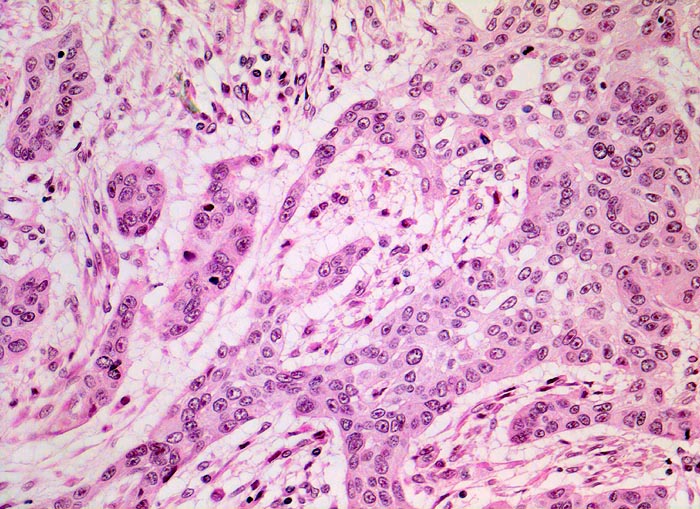 Der Tumor bildet anastomosierende Zellstränge. In diesem Bildausschnitt ist keine Verhornung erkennbar. Die Tumorzellen sind mässig polymorph und die Kern-Zytoplasma Relation ist deutlich zu Gunsten des Kerns verschoben. Zwischen den Zellsträngen lockeres Tumorstroma.